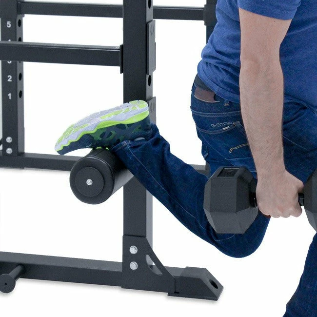 The easily removable leg roller is versatile and suitable for exercises from basic stretching exercises to one-leg squats, Bulgarian squats, and glute/ham work.