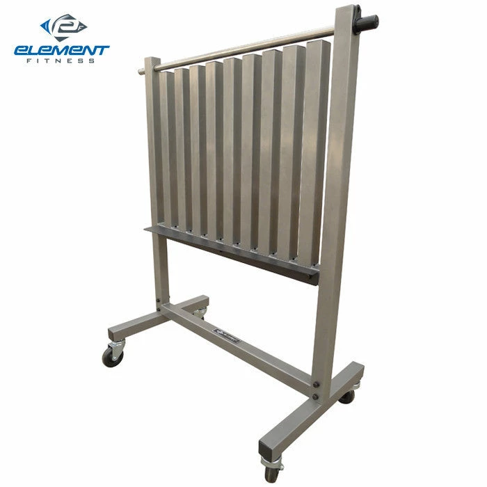 Neoprene/Vinyl Dumbbell Rack is a vertical stacking system with a chrome security bar to deter theft and includes casters for easy mobility. It is designed to hold Neoprene or Vinyl Dumbbells from sizes 1 to 12 lbs.