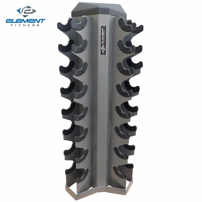 Element’s 8 Pair Vertical Dumbbell Rack’s unique, patented, front-load design allows users to remove and replace Hex dumbbells with ease. This space-efficient design fits flat against the wall. Injection-molded top and cradles with easy to read labels allow for correct dumbbell placement.