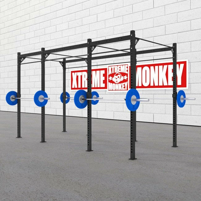 The XM 14-6V1 Free Standing rig is the most popular rig size that people set up. the 14′ width allows up to 4 x squat stations and 2 x 6′ spacers perfect for pullups, suspension training, functional training and much more. The base unit seen in this pictures includes 4 x J Hooks to allow for squats, bench press & much more.